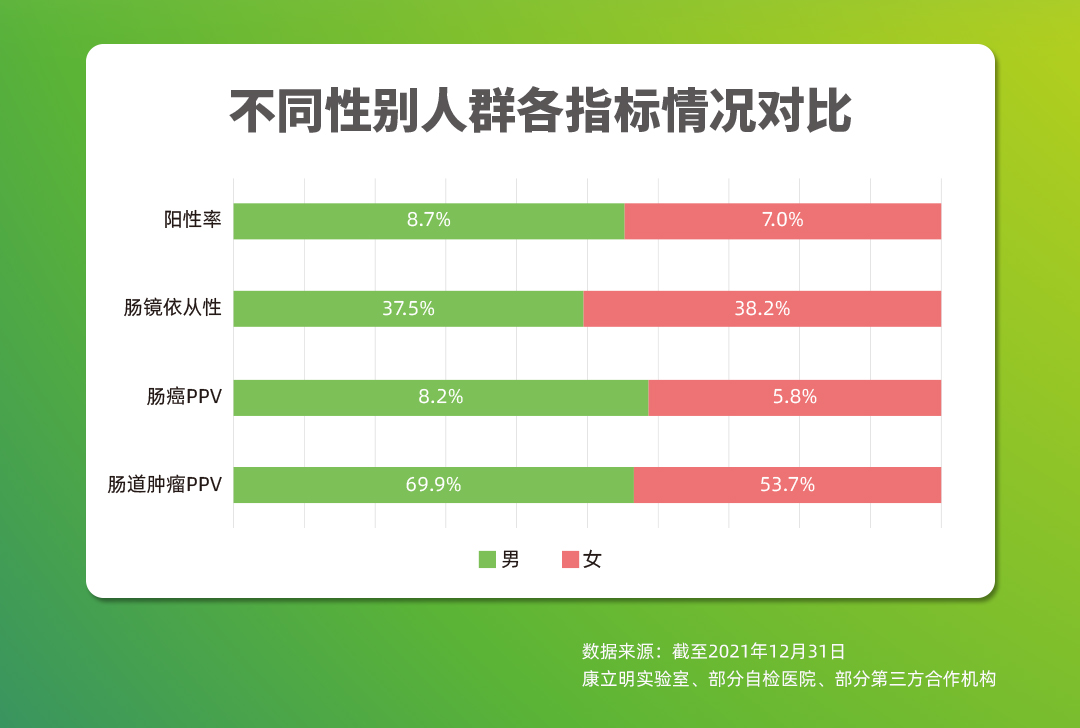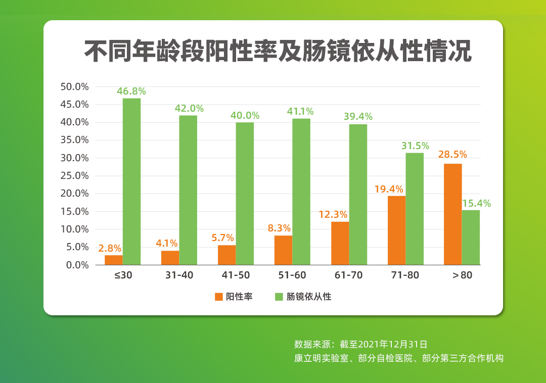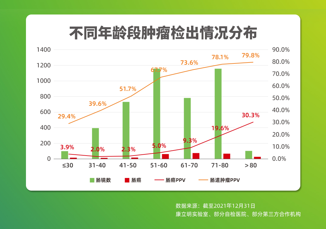 截至2021年12月,作為持續披露真實世界應用數據的腸癌糞便基因檢測產品,長安心®共完成33萬例前瞻性應用檢測,其中175528例應用數據可追溯,12114例受檢者長安心®檢測結果陽性(陽性率6.9%),其中4970例長安心®檢測結果陽性的受檢者進行了腸鏡復查(腸鏡依從性41.0%),一共發現3408例需要治療的受檢者,其中755例腸癌,1444例腺瘤,1209例息肉。長安心®對腸道腫瘤的預測值(PPV)為68.6%(其中腸癌的陽性預測值為15.2%),來自國家科技部項目的數據顯示,長安心®的陰性預測值更是高達99.9%。