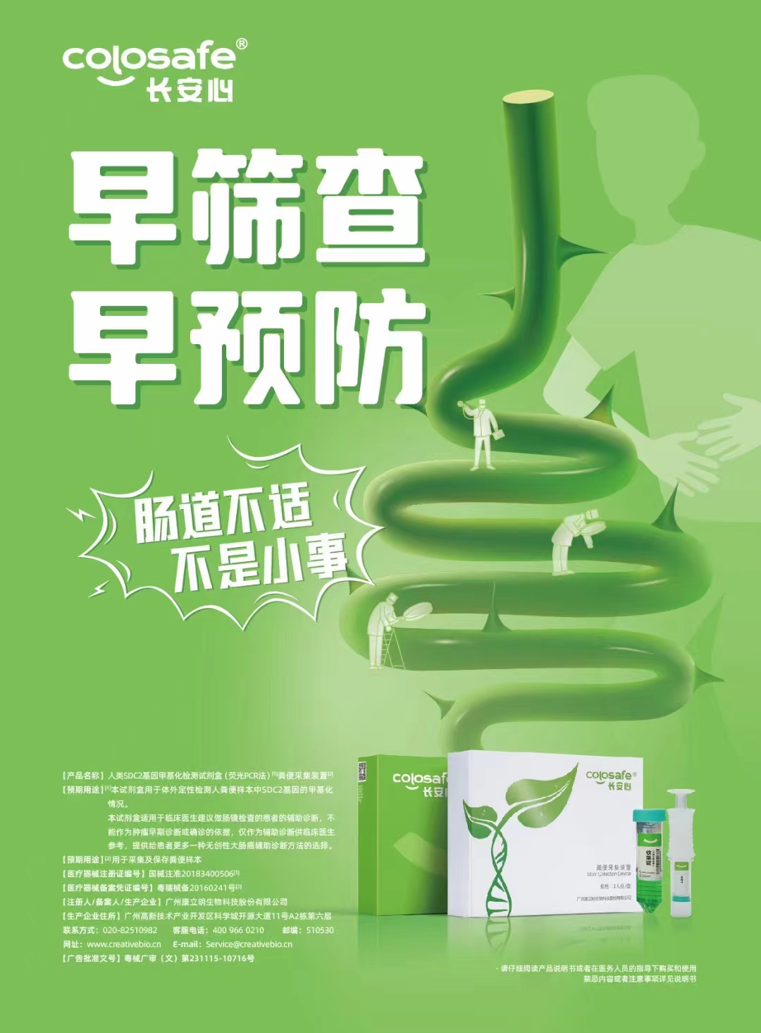 康立明生物自成立以來,始終以“人類健康 我之使命”為崇高愿景,在科學探索的道路上,康立明生物持之以恒,努力實現技術突破和產品開發。長安心®人類SDC2基因甲基化檢測試劑盒(熒光PCR法)于20181120日獲國家藥監局頒發的三類醫療器械注冊證書,是我國率先獲批上市的腸癌糞便DNA檢測試劑盒,成為國內腸癌無創DNA檢測的破冰之作。