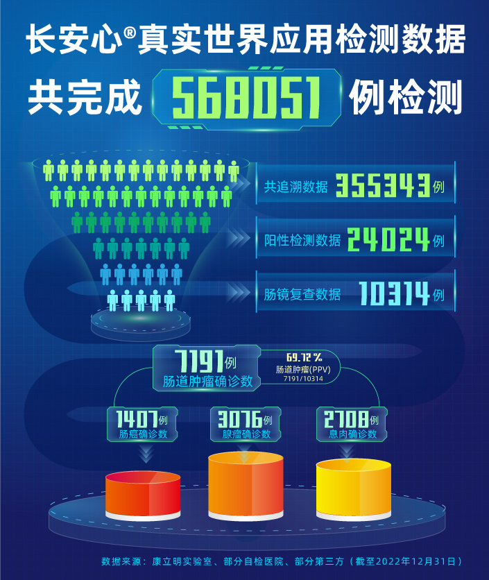 作為持續披露真實世界應用數據的腸癌糞便基因檢測產品,截至20221231日,長安心®共完成568051例真實世界應用檢測,其中355343例應用數據可追溯,24024例受檢者長安心檢測結果陽性(陽性率6.76%),其中10314例陽性檢測結果的受檢者進行了腸鏡復查(腸鏡依從性42.93%),有7191例受檢者確診腸道腫瘤,其中1407例腸癌,3076例腺瘤,2708例息肉。